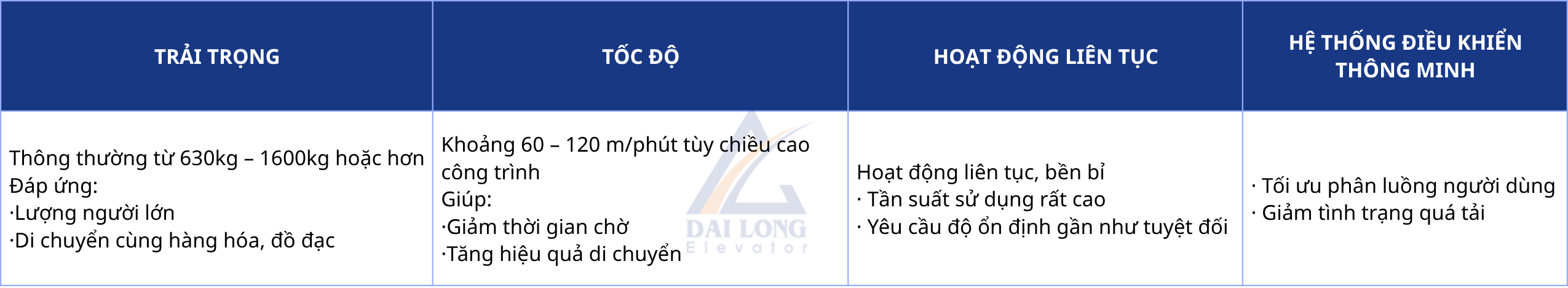 Để đáp ứng nhu cầu vận hành thực tế, thang máy cho loại hình này cần đảm bảo: